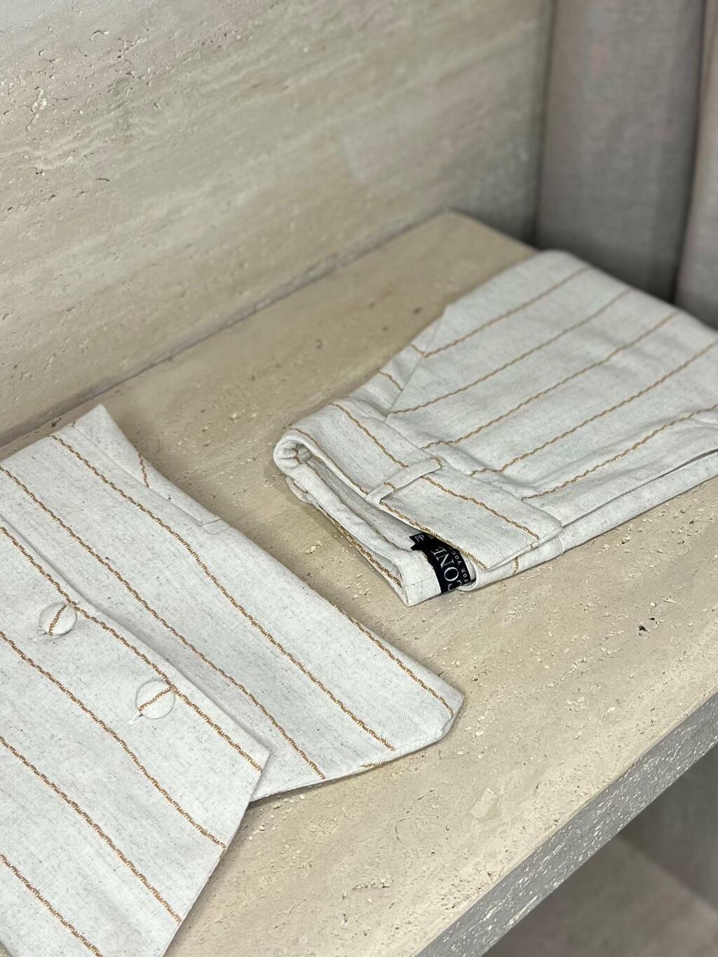 O Conjunto Alfaiataria Linho Annie é a escolha perfeita para quem valoriza a elegância e o conforto. Com um tecido nude listrado, as peças trazem um toque moderno e clássico. O seu corte contemporâneo proporciona um caimento impecável, enquanto a padronagem clássica mantém a essência atemporal.